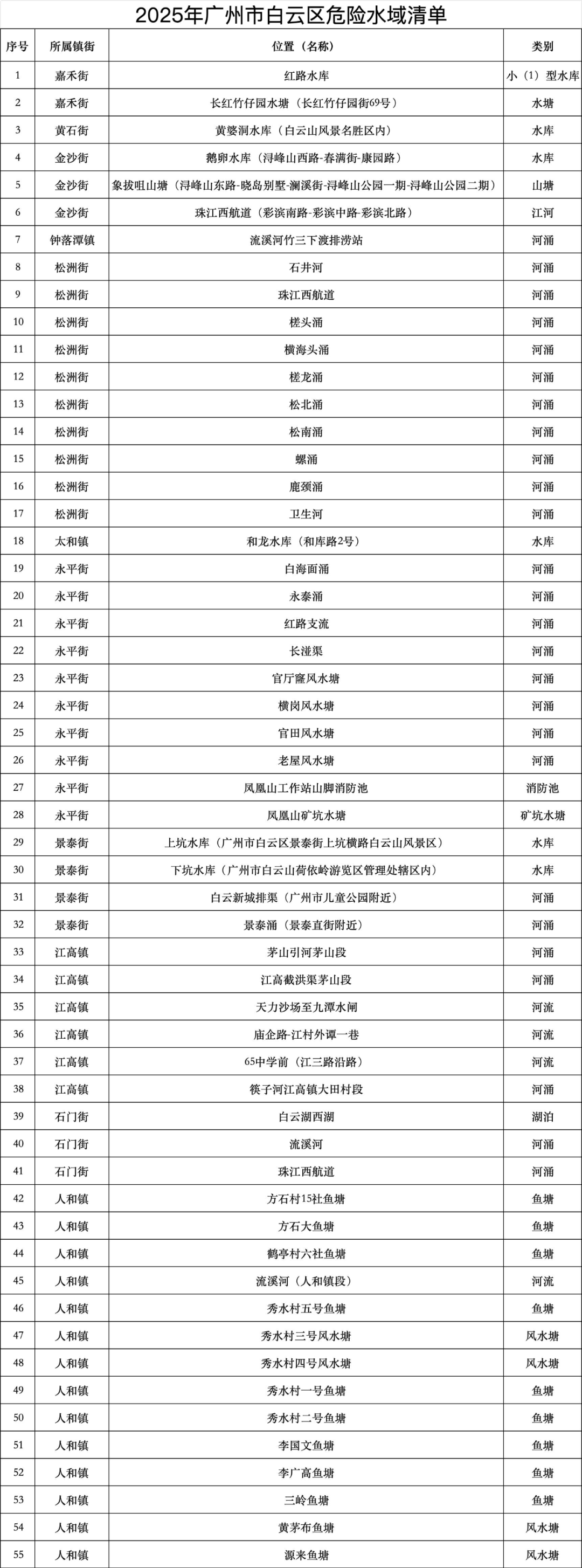 广州市其他区危险水域清单